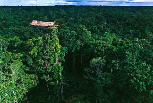 The tree people, Korowai and Kombai, live in the basin of the Brazza River in the vast lowland jungles. This is situated in the foothills of the Jayawijaya mountain range, which is in the southwest part of the New Guinea Island in the Indonesian province Papua (Irian Jaya). Mosquitoes and age-old rivalry forced these tribes to build houses in the tops of trees. Some of them are placed as high as 40 m.